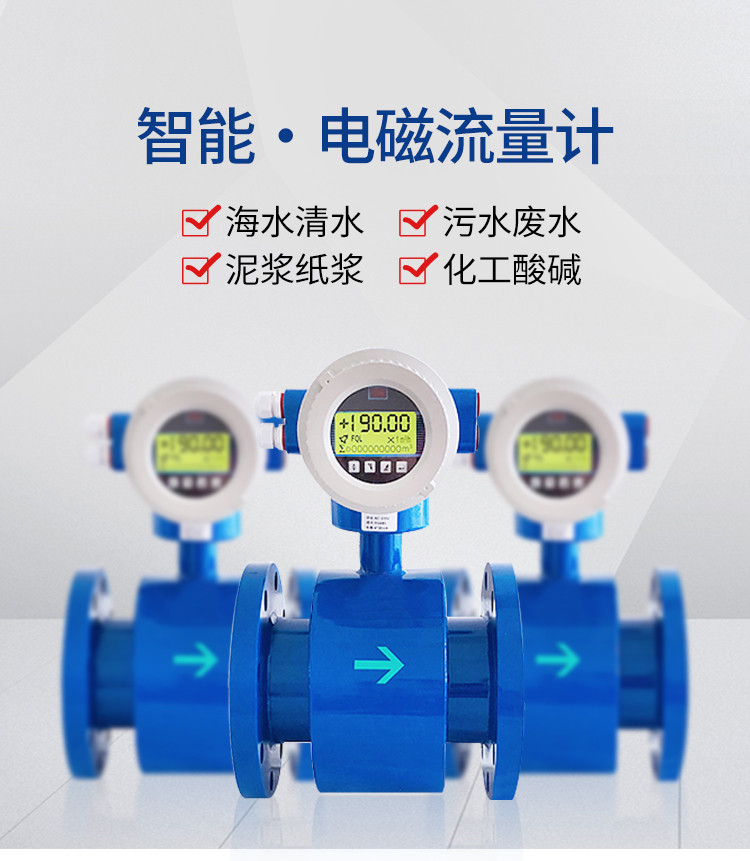 智能电磁流量计主要用于测量封闭管道中的导电液体和浆液中的体积流量。如水、污水、泥浆、纸浆、各种酸、碱、盐溶液、食品浆液等,应用于石油、化工、冶金、纺织、食品、制药、造纸等行业以及环保、市政管理,水利建设等领域。