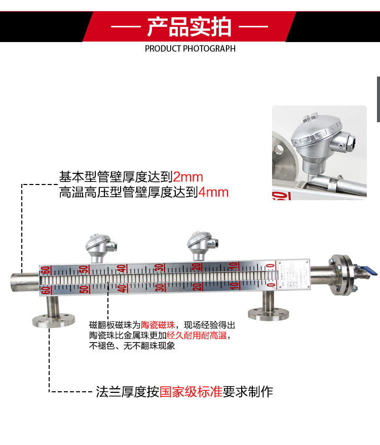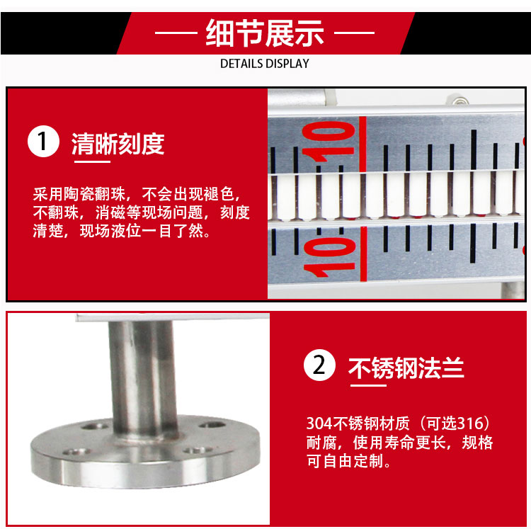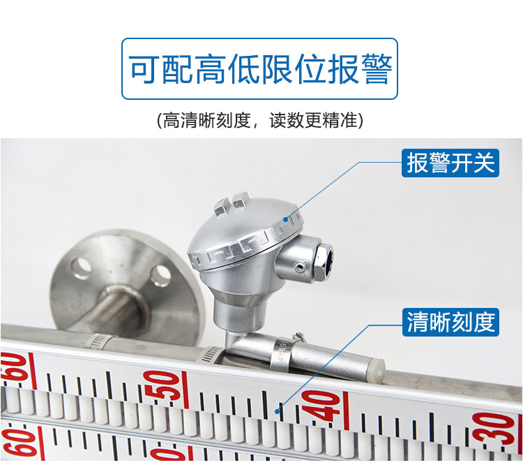 3. 磁耦合翻转:测量管外部装有带磁性翻柱(翻片)的指示器。浮子内的磁钢通过磁场耦合,驱动外部翻柱翻转。翻柱**设计为两面不同的颜色(如红色和白色),当液位上升时,翻柱由白转红;液位下降时,由红转白。红白交界处的刻度即为实际液位高度。