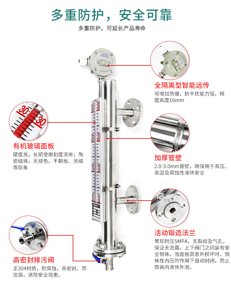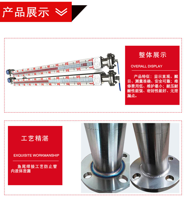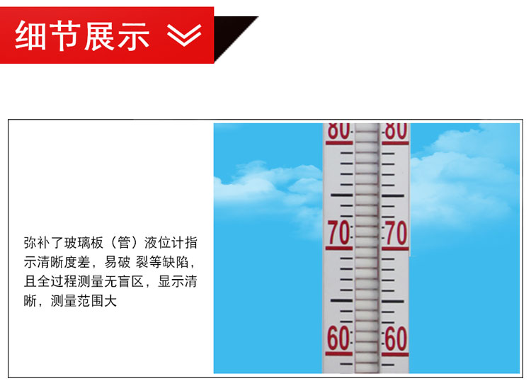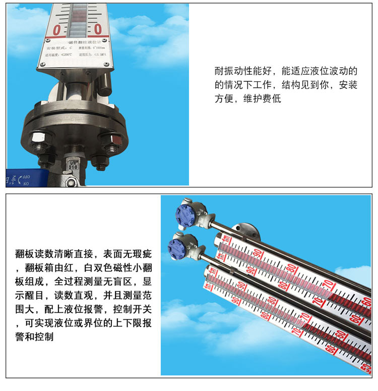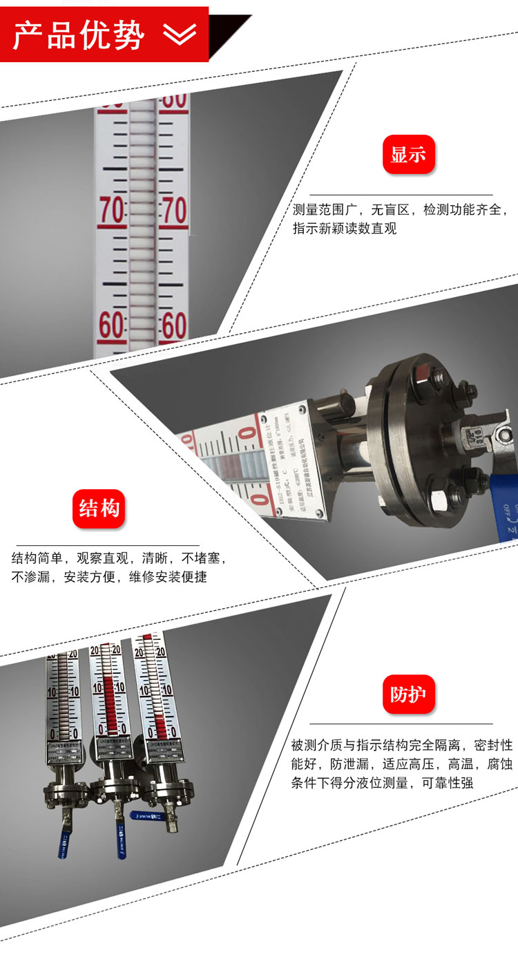 - 显示清晰直观:红白或红蓝双色翻柱指示,即使在光线较暗或距离较远的场合,液位也非常醒目,且没有测量盲区。