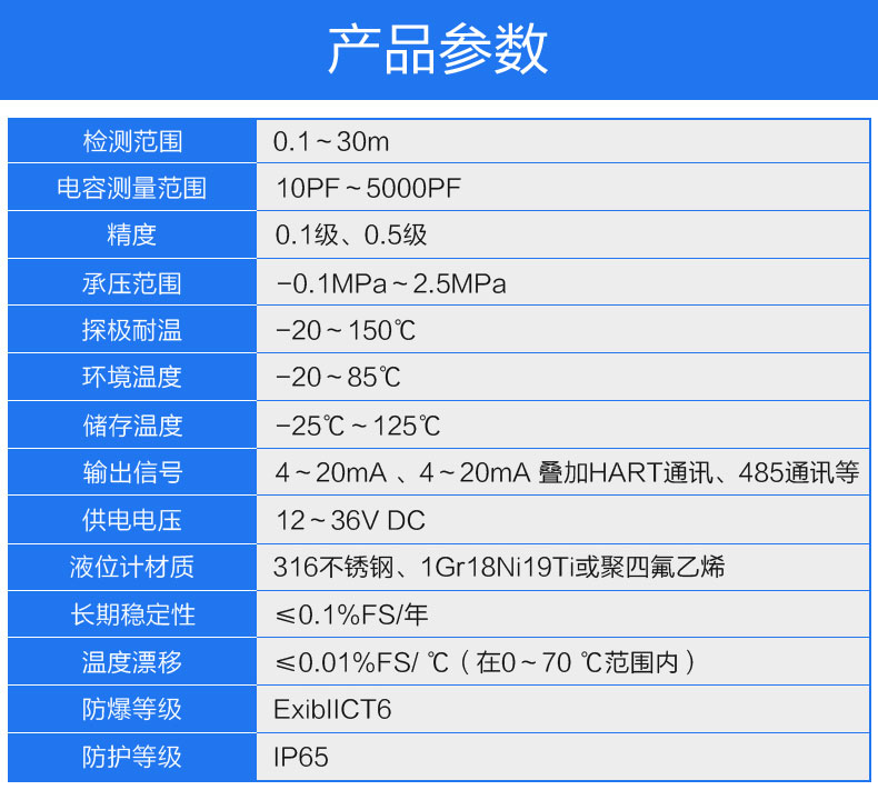 综合各厂商数据,电容式液位计的典型技术参数如下 :