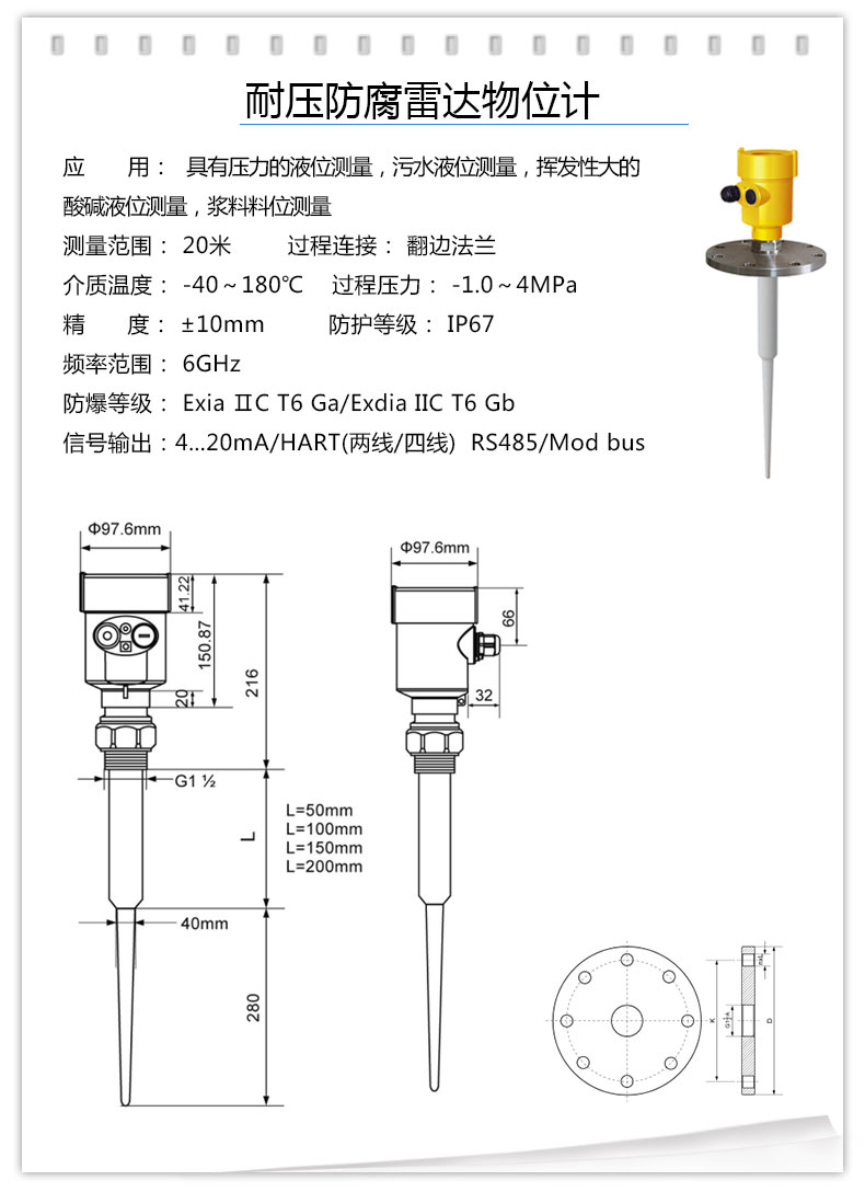 耐压防腐雷达物位计是专为高温、高压、*腐蚀工况设计的非接触式液位测量仪表,**特征在于同时具备高压力等级(*高可达16MPa)和*耐腐蚀性(PTFE/PFA全防腐结构)。它**用于化工反应釜、高压储罐等严苛环境。