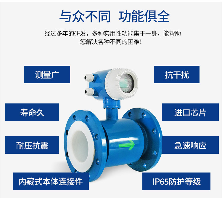 3、电磁流量计是一种体积流量测量仪表,在测量过程中,它不受被测介质的温度、粘度、密度以电导率(在一定范围)的影响。因此,电磁流量计需经水流标定后,用来测量其它导电性液体的流量。