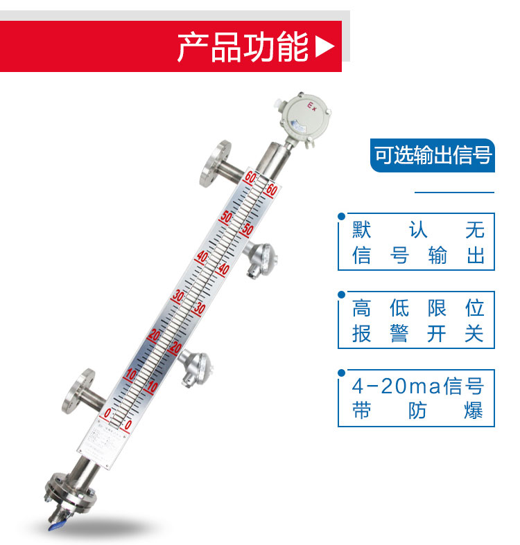 3. 磁耦合翻转:测量管外部装有带磁性翻柱(翻片)的指示器。浮子内的磁钢通过磁场耦合,驱动外部翻柱翻转。翻柱**设计为两面不同的颜色(如红色和白色),当液位上升时,翻柱由白转红;液位下降时,由红转白。红白交界处的刻度即为实际液位高度。