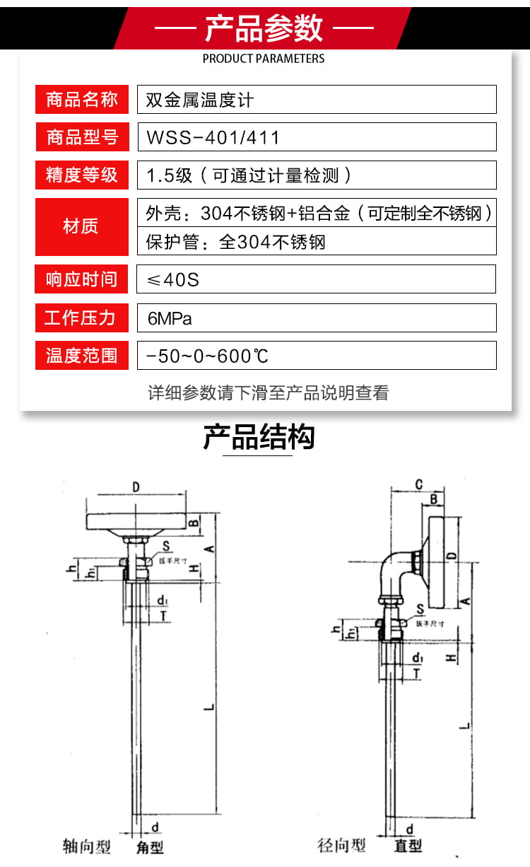 - 关键参数:热响应时间**≤40秒,反应比较迅速。表盘直径和插入深度(L)可根据管道或设备接口定制。